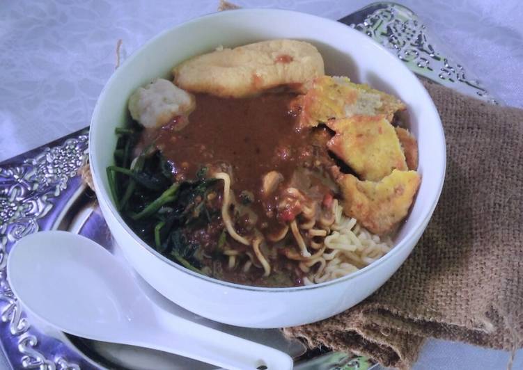 - Beri bumbu kacang menggunakan spatula,taburi dg bawang goreng.Siram dg kuah baso jangan lupa basonya ya bunda beri sedikit kecap dan beri kerupuk secukupnya.